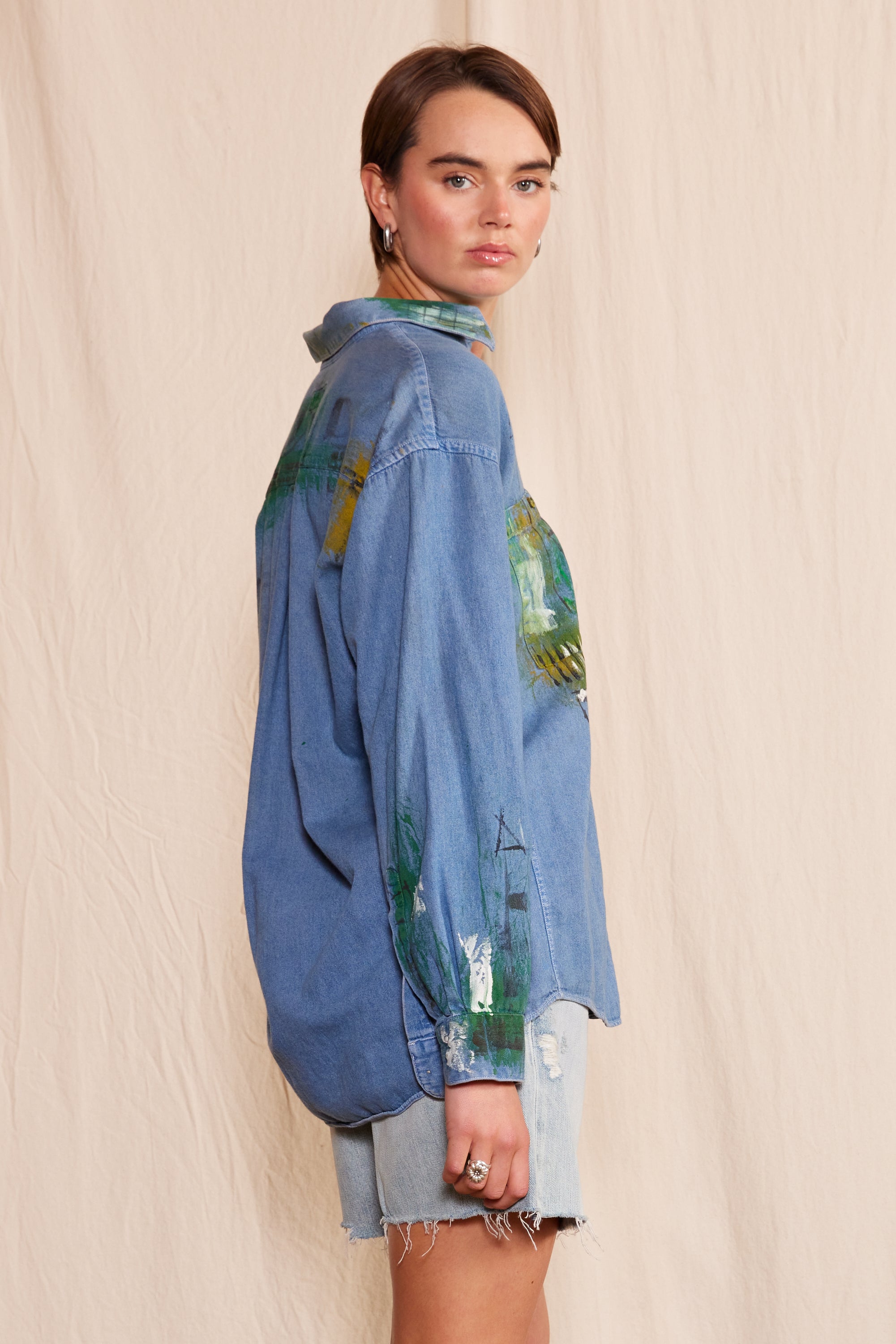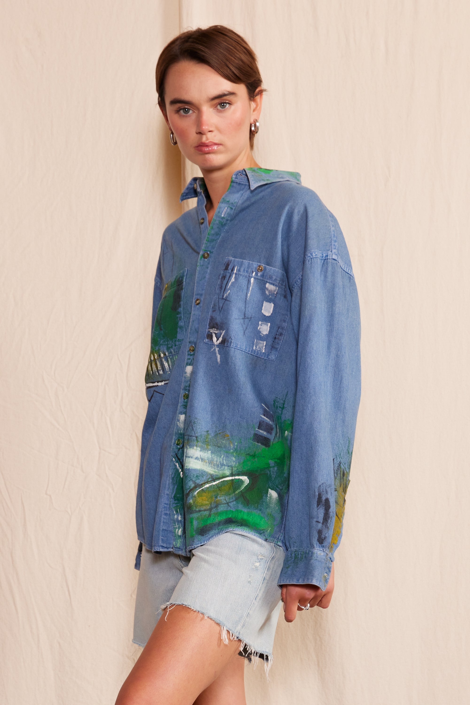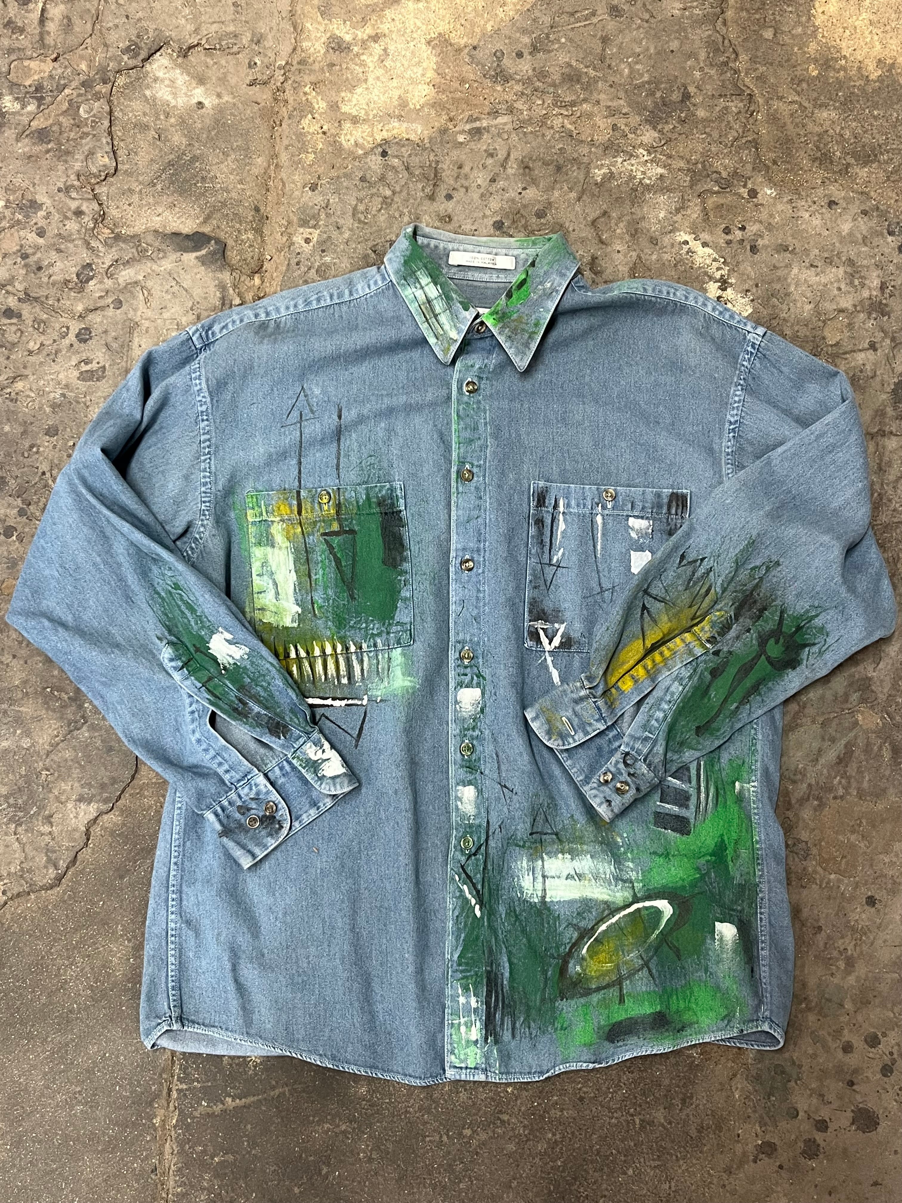Artisan Hand-Painted Emerald Echo Denim Shirt