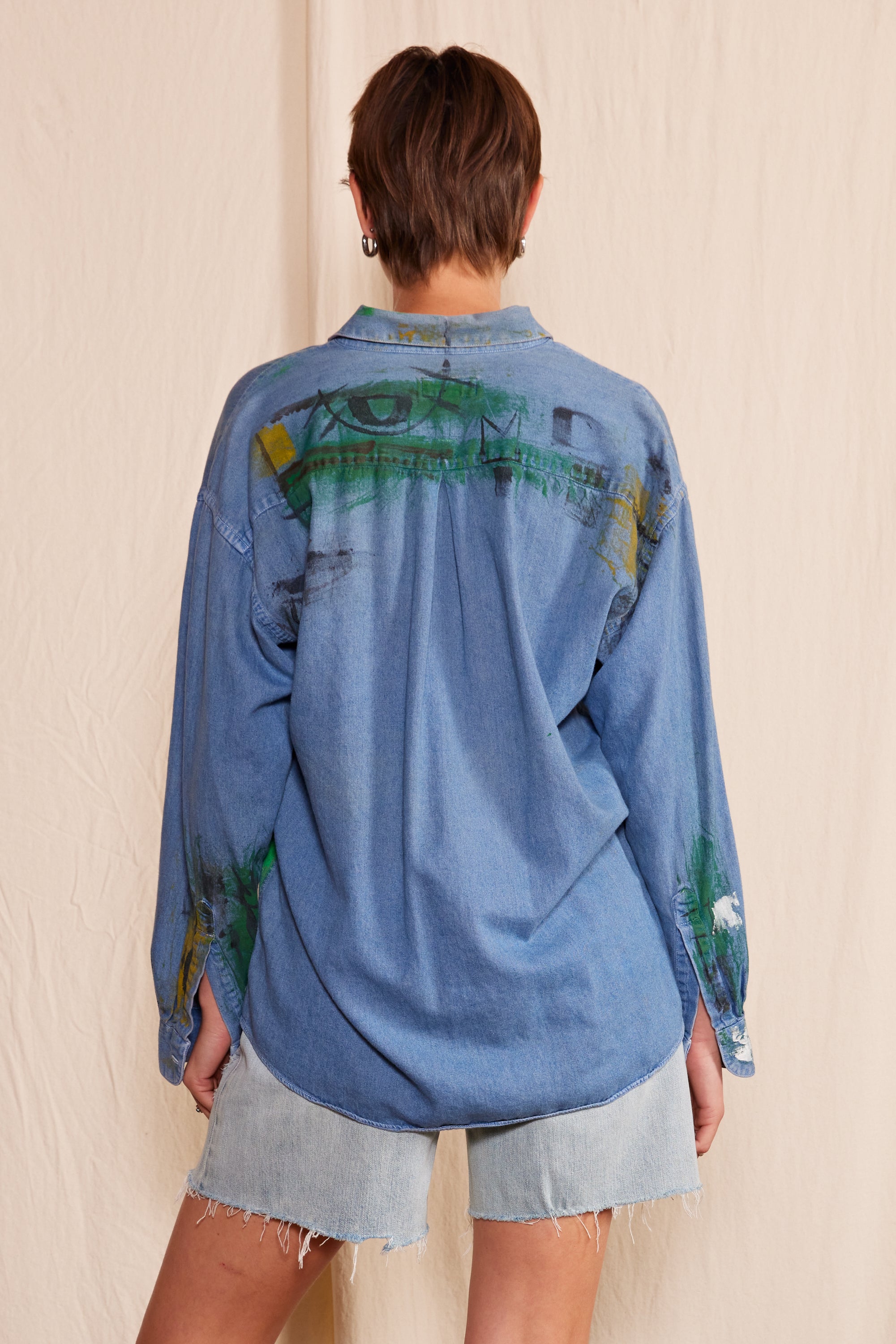 Indulge in the epitome of sustainable luxury with our Artisan Hand-Painted Emerald Echo Denim Shirt. Hand-painted by a Los Angeles artist, this one-of-a-kind piece features vibrant splashes of paint and unique distressed details. Crafted from ethically sourced materials, it's perfect for the eco-conscious fashion aficionado.