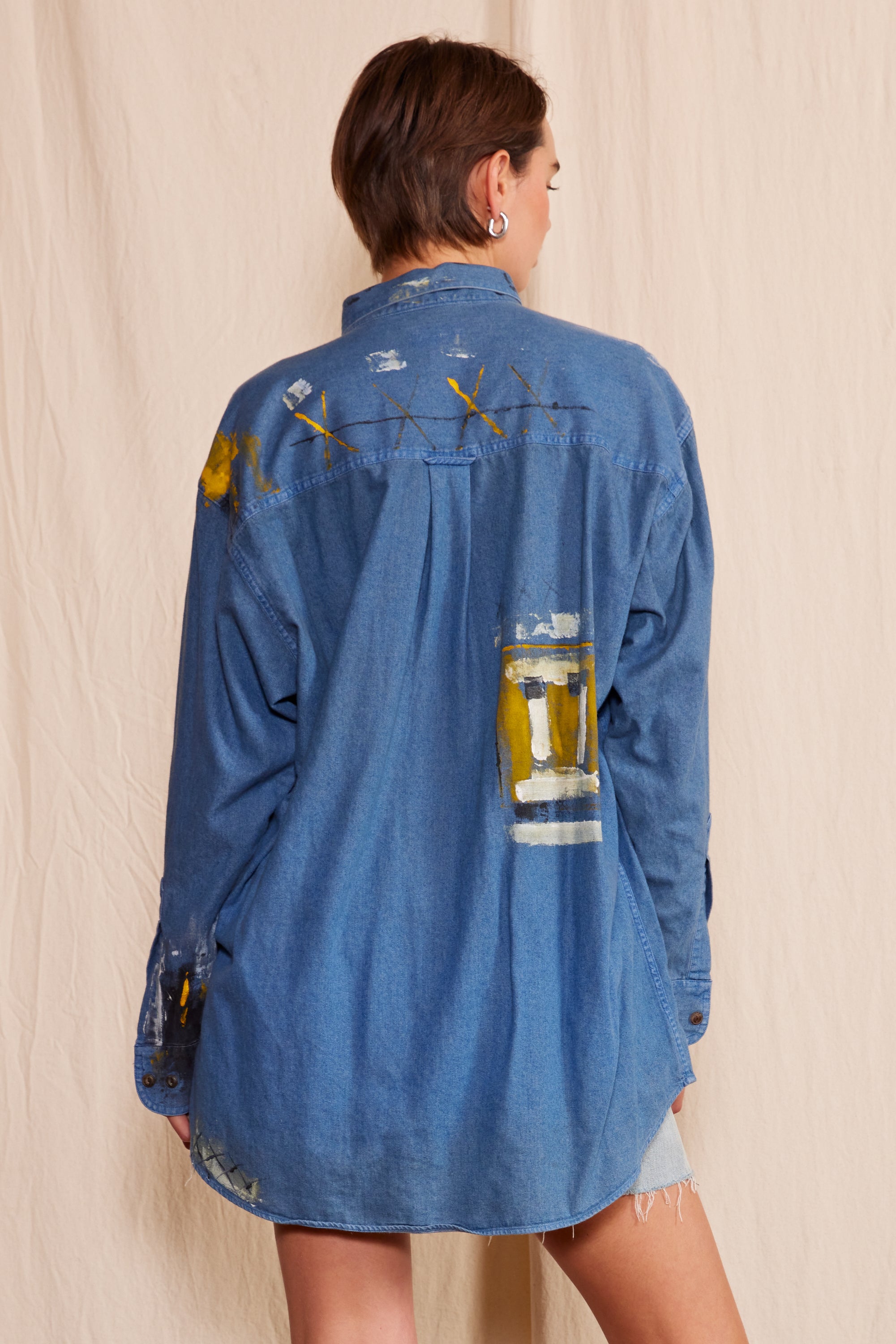 Indulge in the epitome of sustainable luxury with our Artisan Hand-Painted Golden Sun Denim Shirt. Hand-painted by a Los Angeles artist, this one-of-a-kind piece features vibrant splashes of paint and unique distressed details. Crafted from ethically sourced materials, it's perfect for the eco-conscious fashion aficionado.