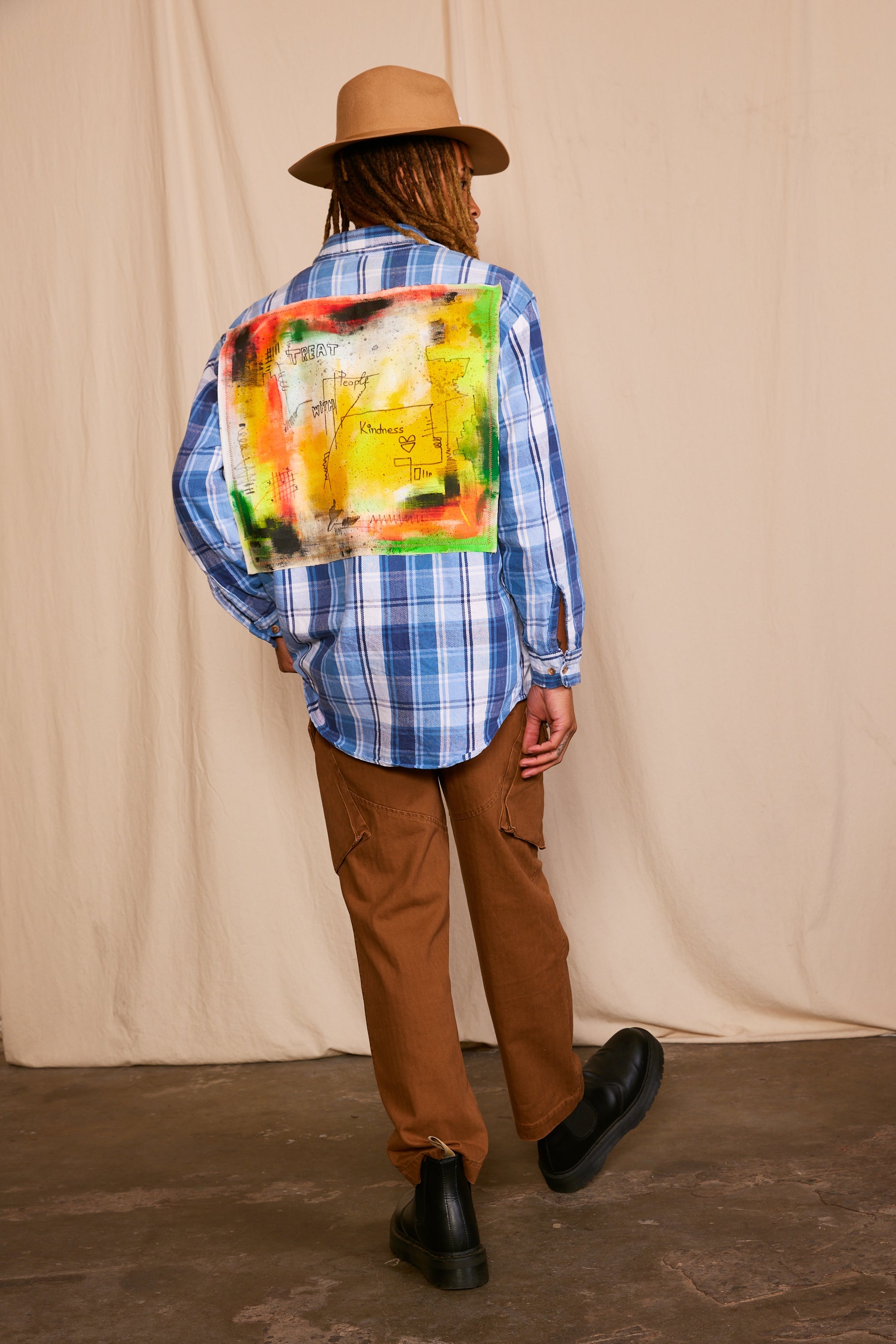 Indulge in the epitome of sustainable luxury with our Artisan Hand-Painted Kindness Canvas Plaid Shirt. Hand-painted by a Los Angeles artist, this one-of-a-kind piece features vibrant splashes of paint and unique distressed details. Crafted from ethically sourced materials, it's perfect for the eco-conscious fashion aficionado.