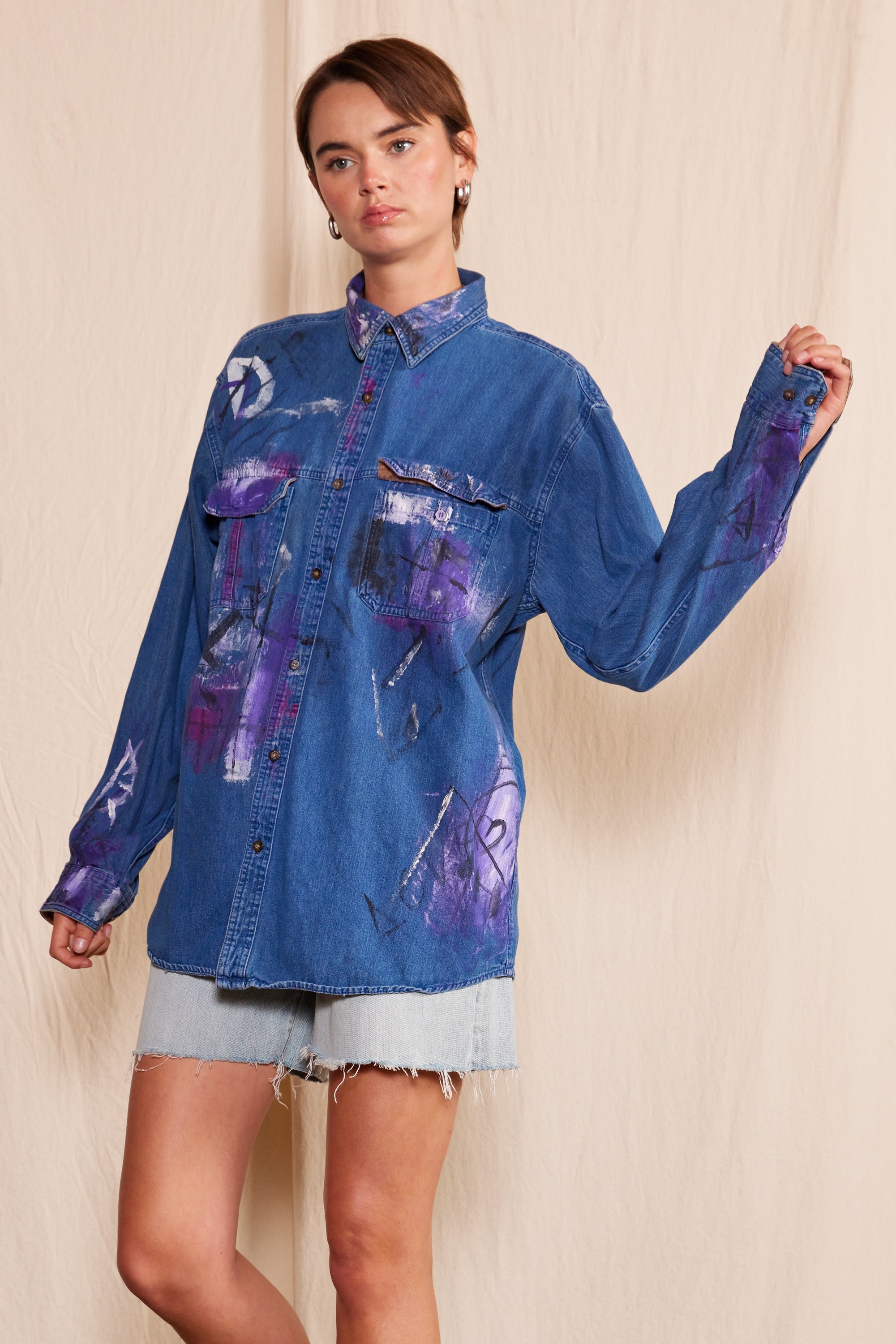 Indulge in the epitome of sustainable luxury with our Artisan Hand-Painted Midnight Muse Denim Shirt. Hand-painted by a Los Angeles artist, this one-of-a-kind piece features vibrant splashes of paint and unique distressed details. Crafted from ethically sourced materials, it's perfect for the eco-conscious fashion aficionado.