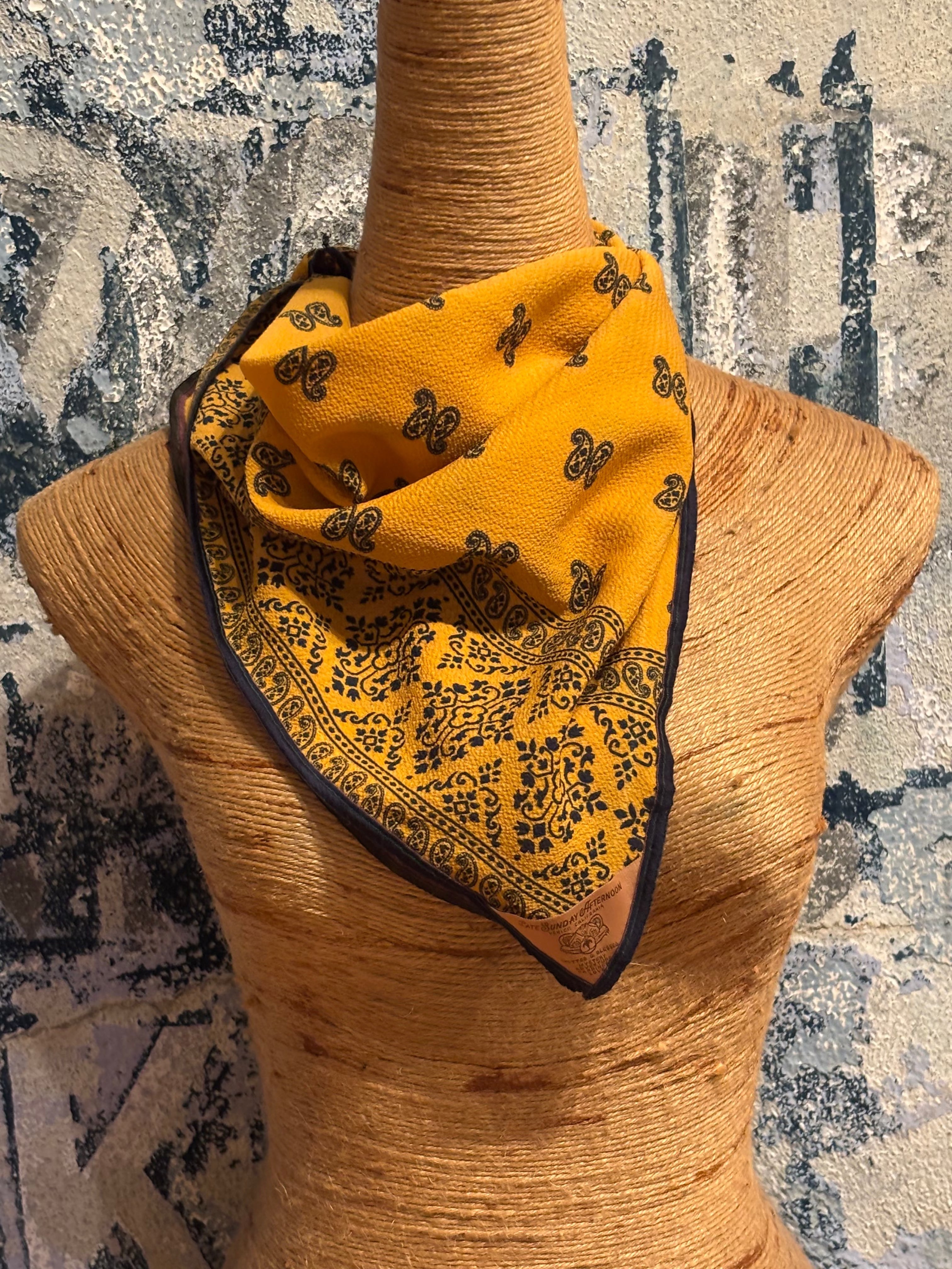 LSA original Autumn Paisley Bandana, in a warm mustard vibe, with accents of navy paisleys on silk.
