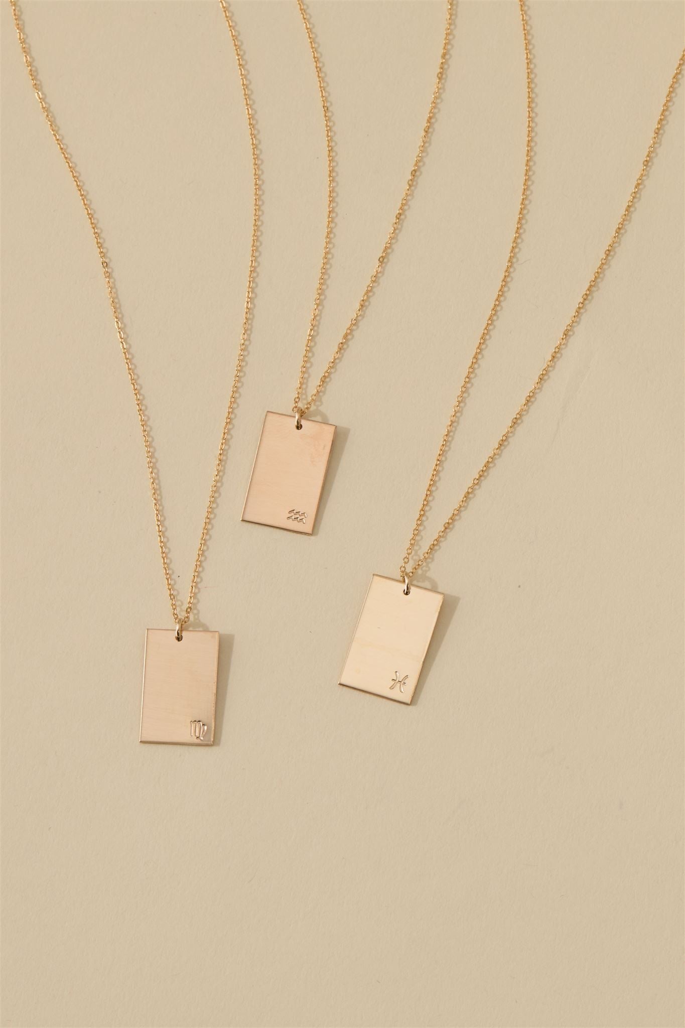 • 14k Gold Filled chain + hand stamped horoscope sign on 14k Gold Filled 0.5x0.75” rectangle pendant