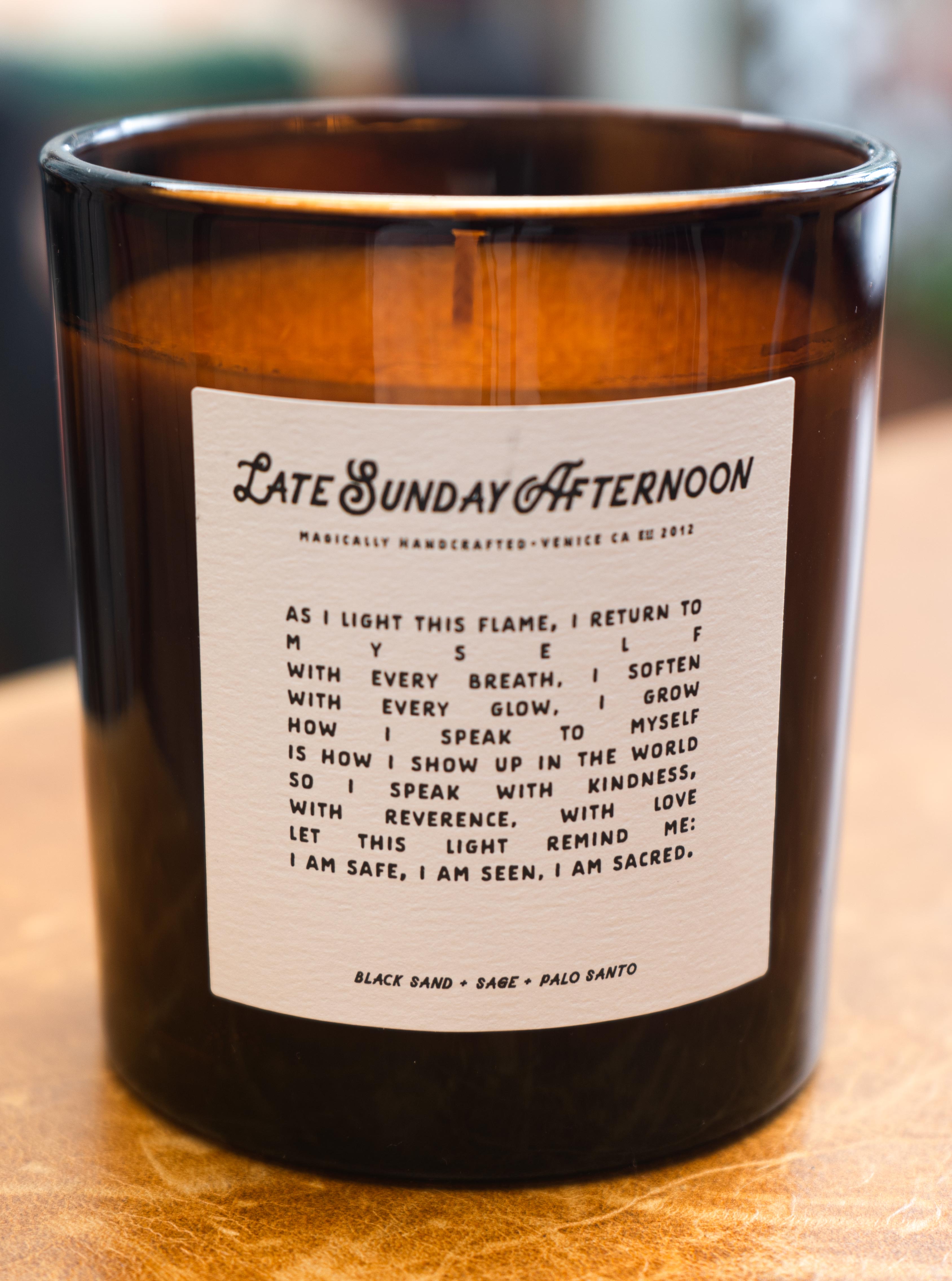 Set your intention with us with our new hand crafted Late Sunday Afternoon Candle. This candle combines the earthy and uplifting aromas of Black Sand, Sage, and Palo Santo.