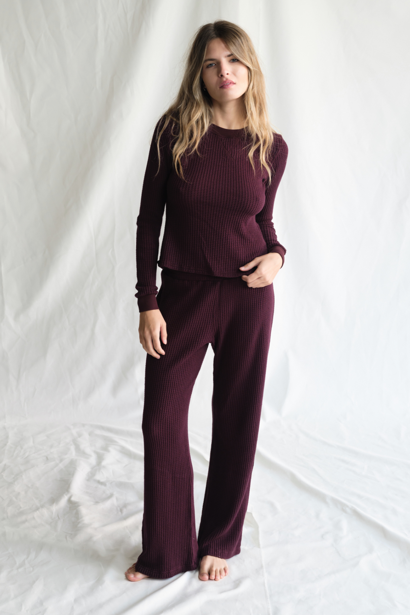Crafted from a luxurious, super-soft blend featuring hemp, this top is not only gentle on your skin but also a more eco-friendly choice. The classic waffle knit texture provides a lovely dimension and just the right amount of warmth, making it perfect for transitional weather or cozy evenings.