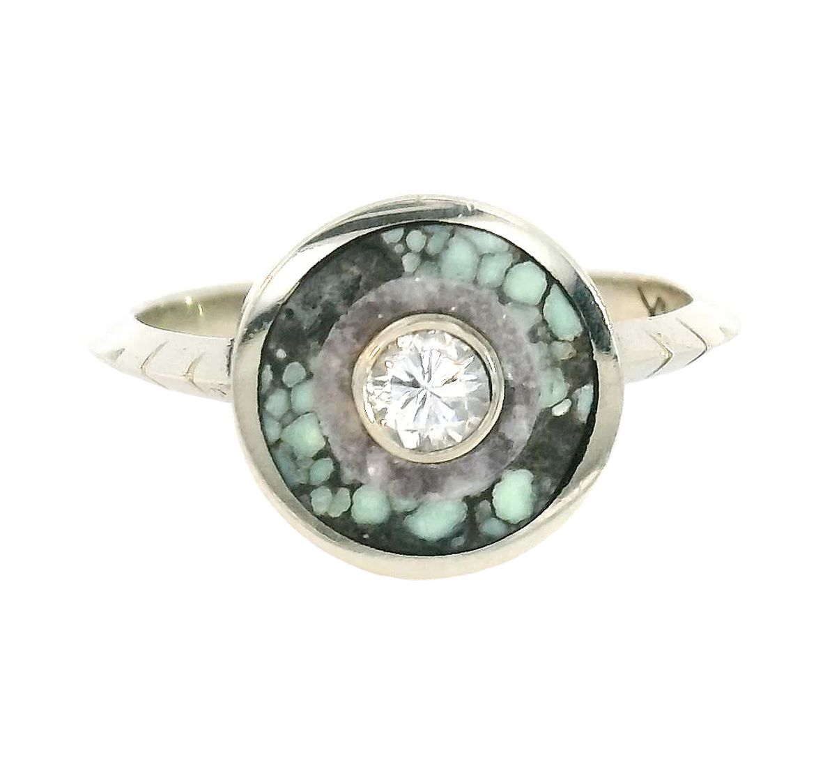 This size 6.5 ring features concentric circles of hand inlaid Colina Verde Variscite & Lepidolite highlighted with a sparkly white diamond. This one of a kind ring is a modern and fun statement on color and design!  A truly creative, collectable piece of Young In The Mountains inlay work.