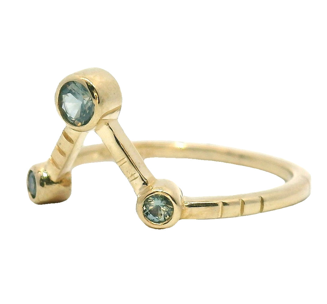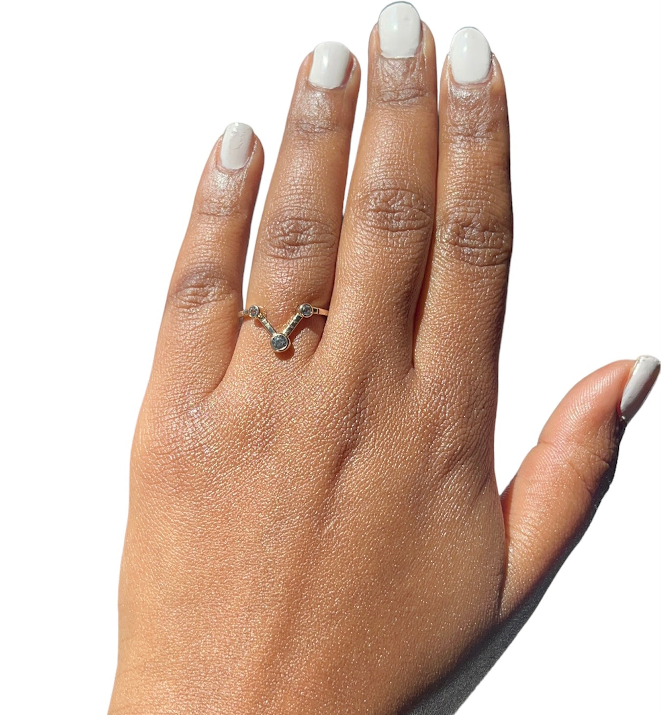 Three Montana sapphires create a peak of beauty. Two .03 ct sapphires and one .10 ct sapphire create different impacts of sparkle. Perfect worn solo or stacked! This ring is ready to ship in various sizes. It can be resized up or down within 3 sizes.Β