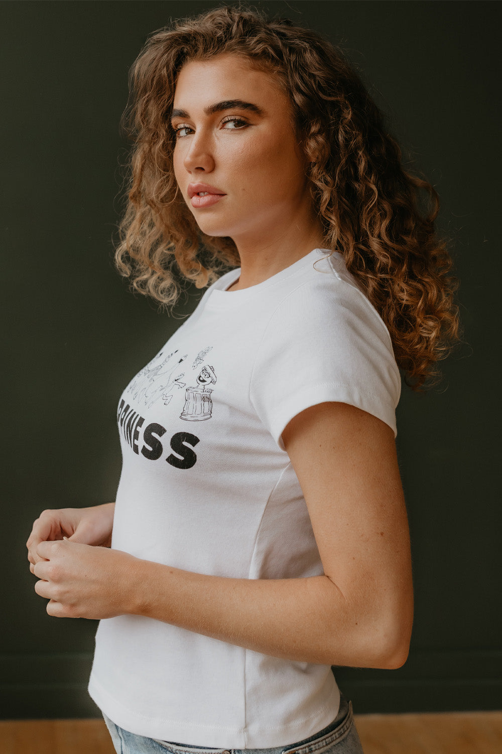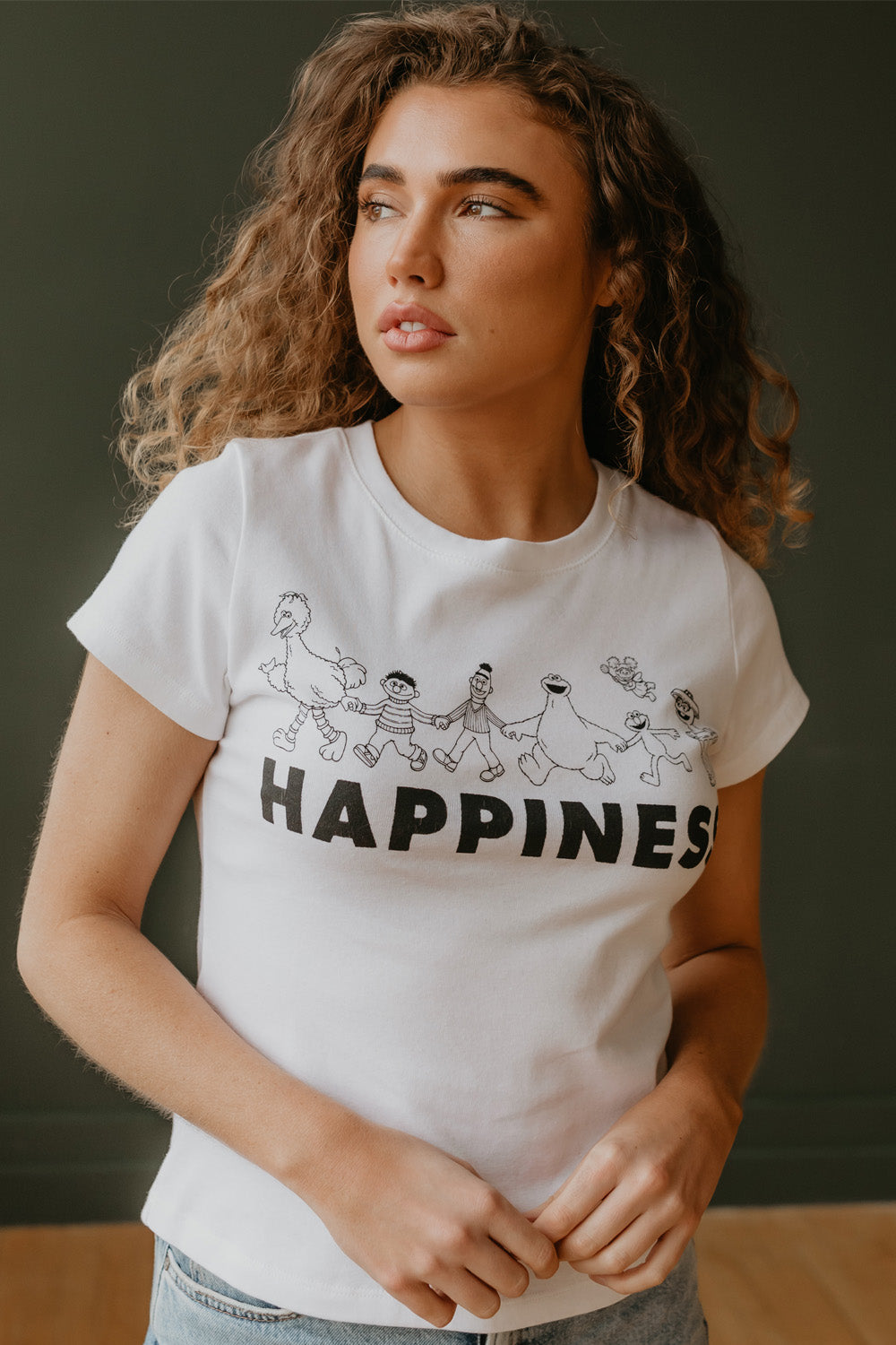 The Sesame Street Baby Tee is ethically crafted in Los Angeles, this T-shirt blends the comfort of 100% organic cotton with the joyous spirit of the iconic Sesame Street crew. The 'Happiness' graphic reflects cherished memories reimagined for the environmentally conscious fashionista. Own a piece of exclusivity that celebrates both style and sustainability.