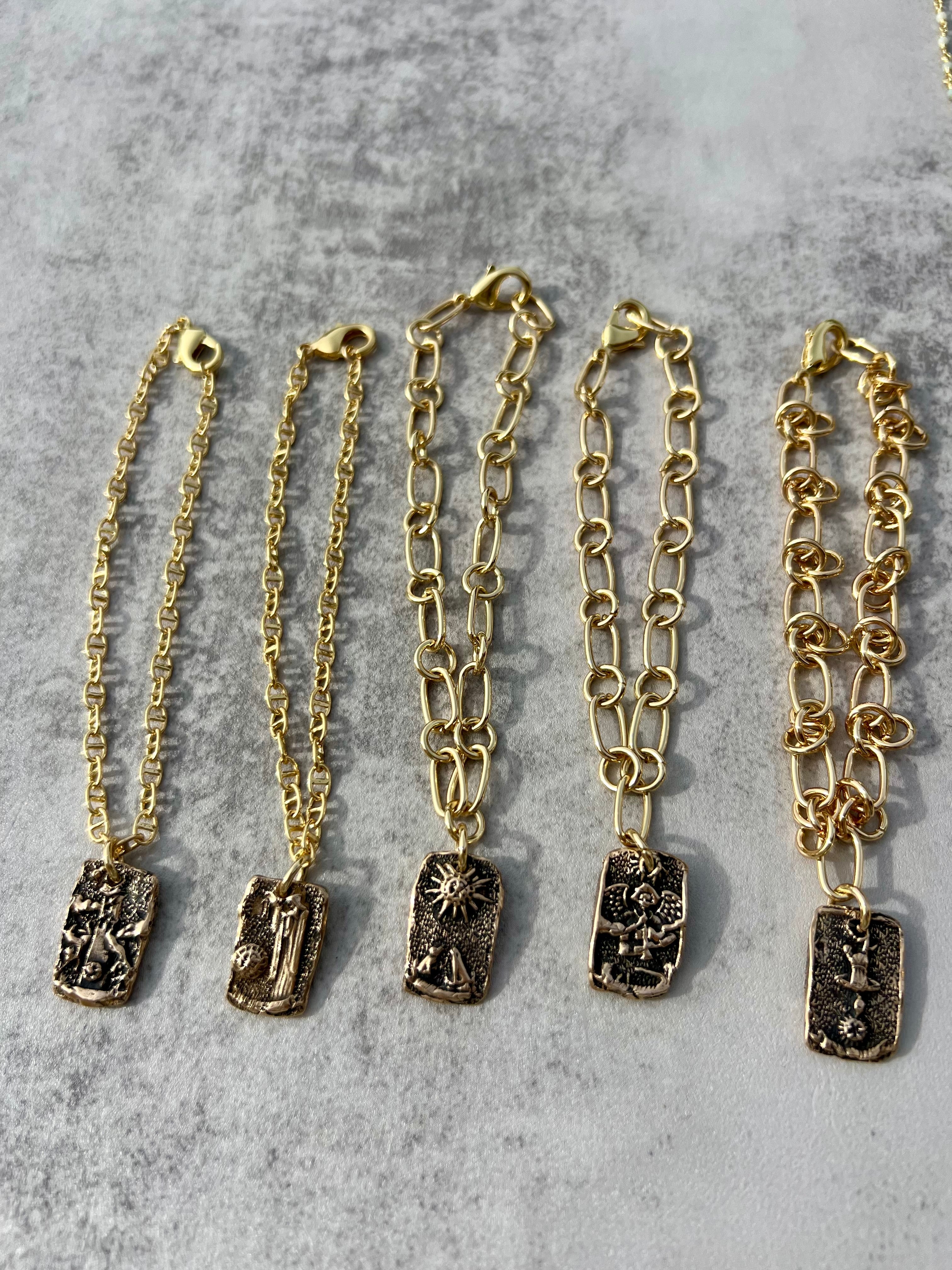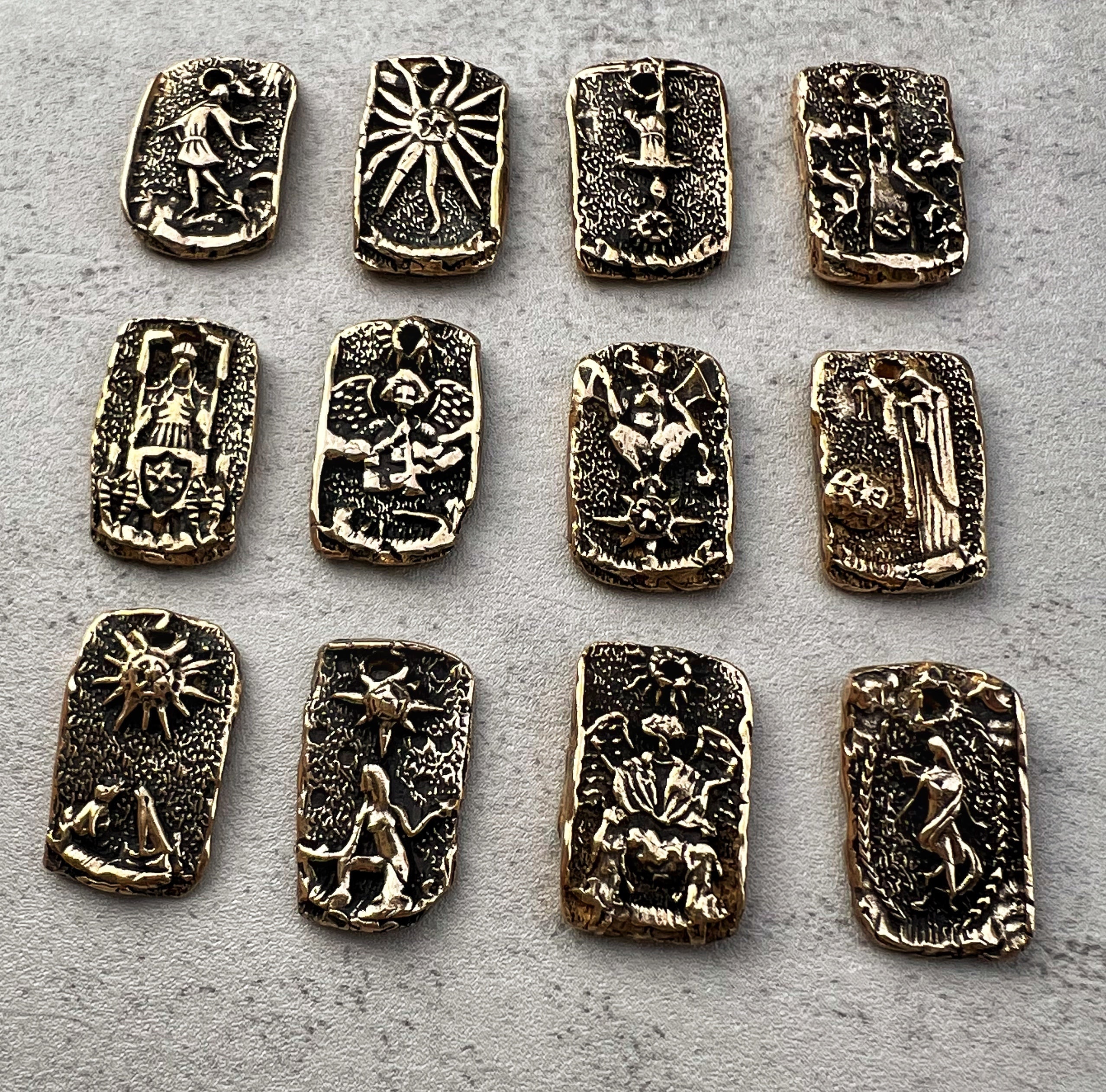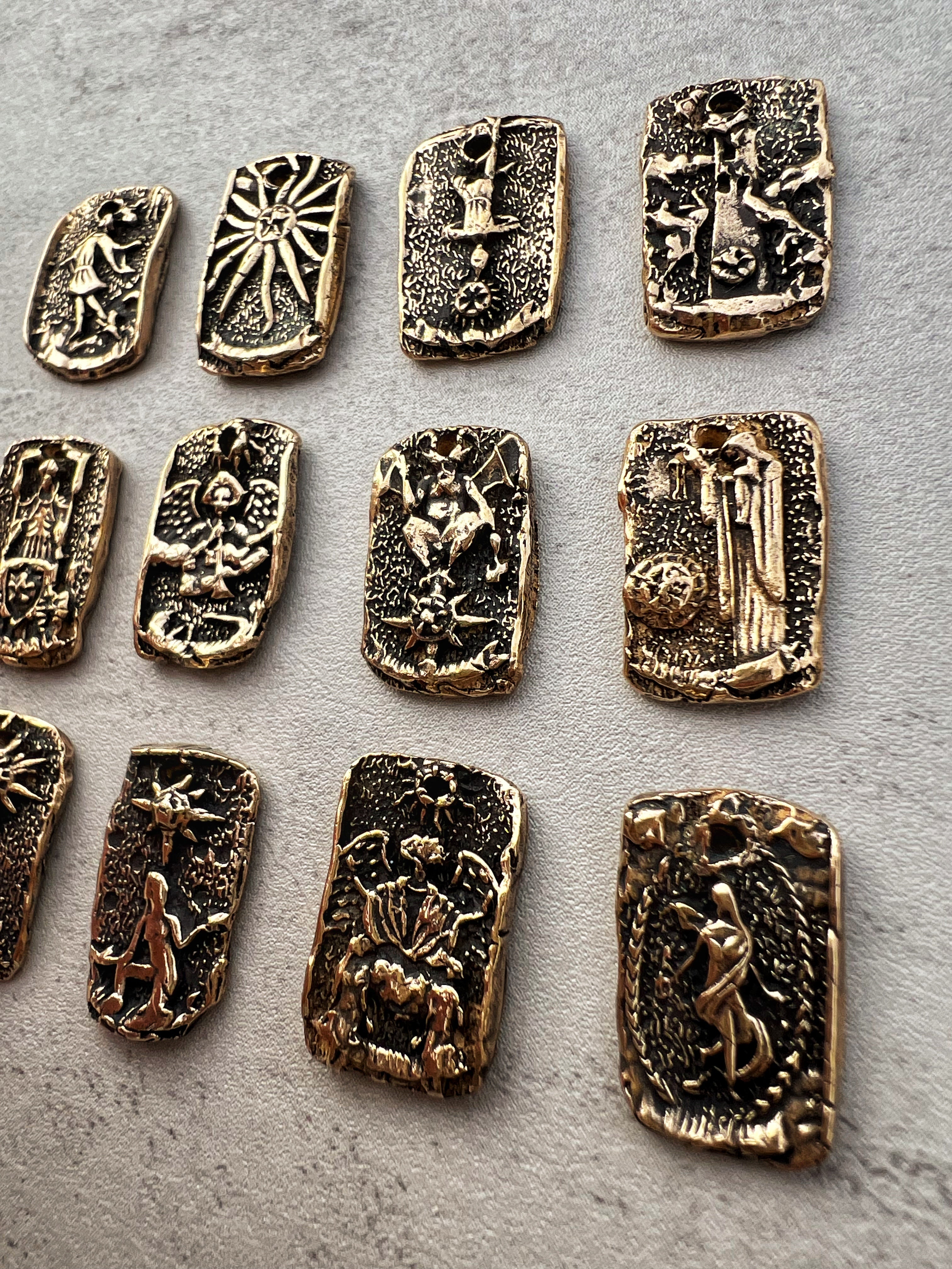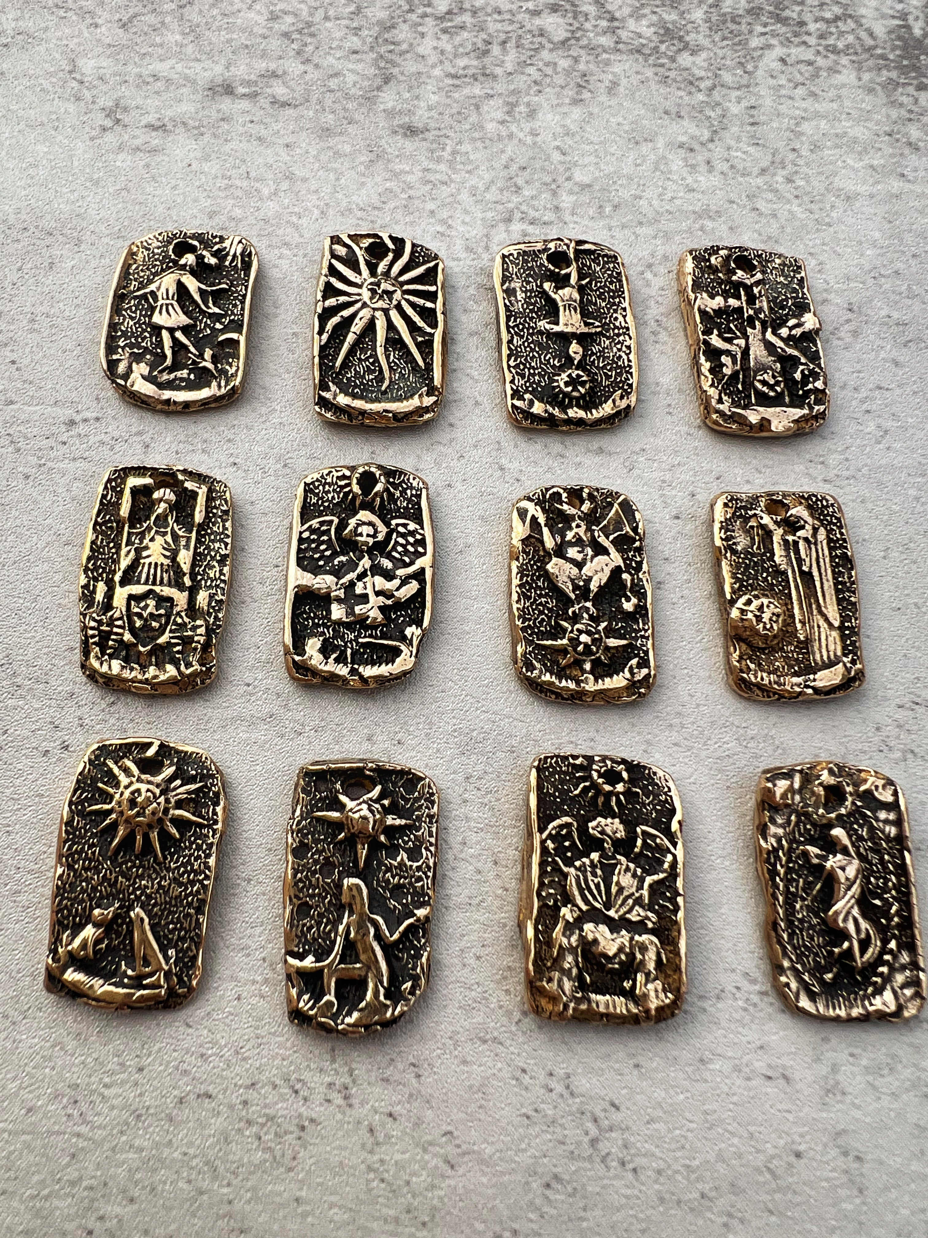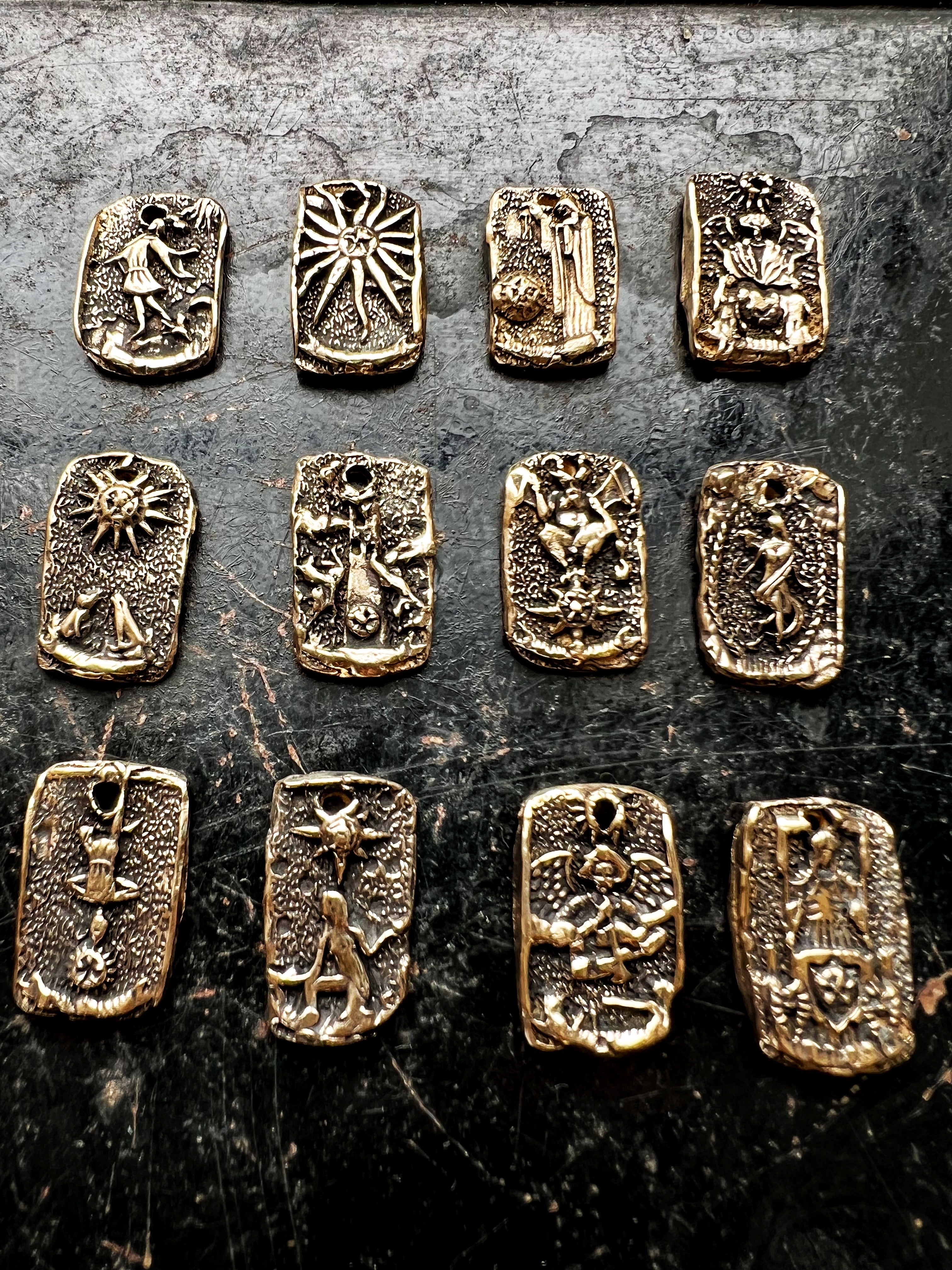 Crafted with intention and care, these handmade tarot medallions undergo a firing process in bronze or sterling silver. Each piece is carefully sanded, oxidized, and polished to achieve a refined finish that highlights the intricate details. Available in your choice of metal, these kiln-fired charms combine artisanal craftsmanship with timeless appeal. Allow 2-3 business days to ship.