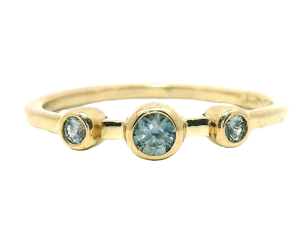 This ring is a size 7. It can be sized up or down within 3 sizes. Add some color to your style with the Cerberus Montana Sapphire Ring. This ring has a yellow gold band and is bezel set with three blue-green sapphires. It's a powerful piece that won't go unnoticed and is durable and comfortable for everyday wear.Β  Β Perfect for celebrating a new baby and a new family of three! Or to honor three children.Β