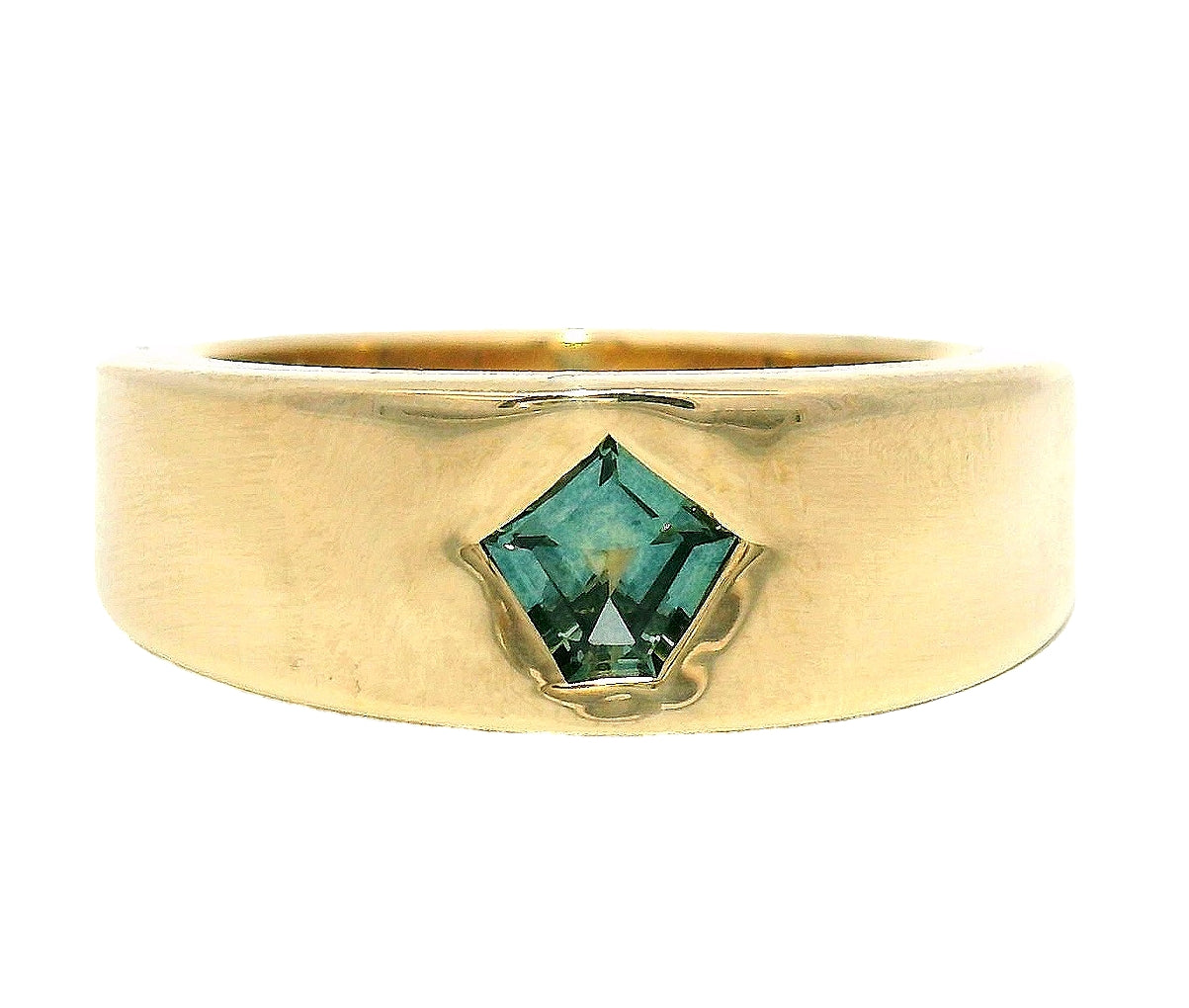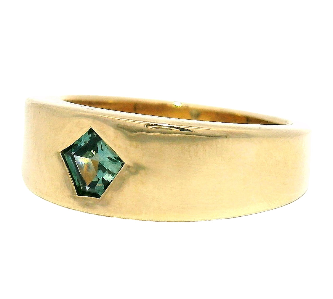 A teal and blue, kite cut Montana sapphire is flush set in a wide golden band. This ring tapers at the back for a comfortable fit and has a great weight. The special nature of this sapphire hidden in the gold glow of the ring, makes for a wedding band worth of your love. If your the style of person to value beauty and unique style, this one of a kind ring is for you.Β